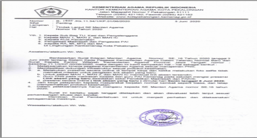 Selamat siang teman-teman Mahasy, akhirnya SE Nomor B-1925/Kk.11.34/1/KP.01/06/2020 dari kemenag kota Pekalongan tindak lanjut dari korwil sudah terbit dan didalamnya diputuskan untuk mulai dilaksanakannya WFO (Work From Office) yang dimulai dari hari ini, Senin 8 Juni 2020.